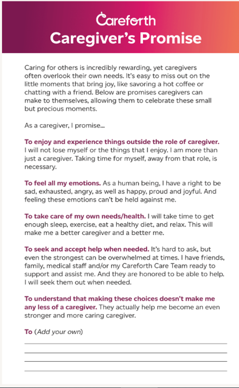 As a reminder, we’ve created The Caregiver’s Promise. Several simple yet powerful promises you can make to yourself to help remind you that your needs are important too. Taking these little moments to prioritize your well-being is not only good for your physical and mental health, but also powers you through the good days and the harder ones.